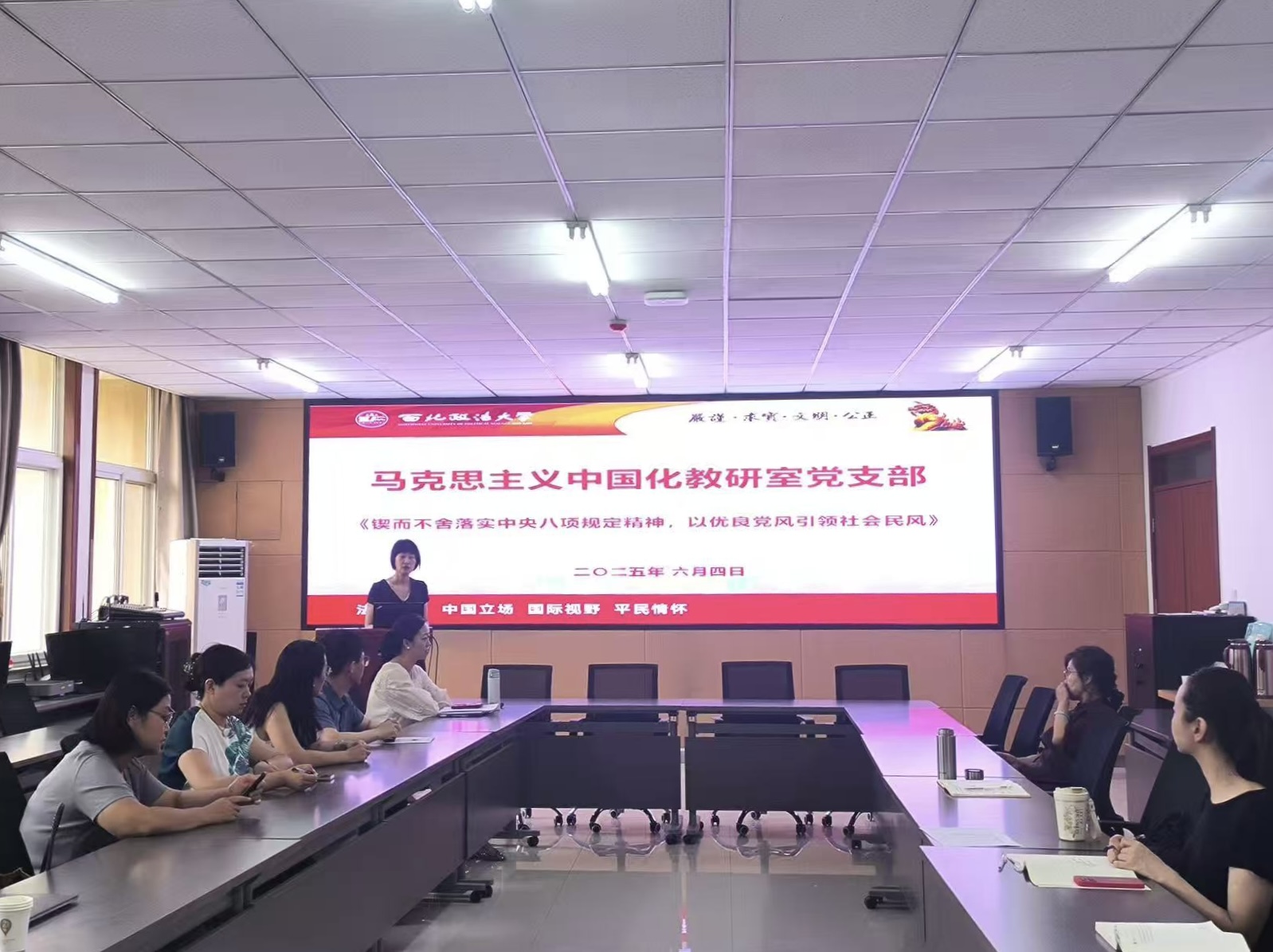 6月4日下午,马克思主义中国化教研室党支部开展“深入贯彻中央八项规定精神学习教育”主题党日活动,支部书记赵金莎及全体党员参加。
