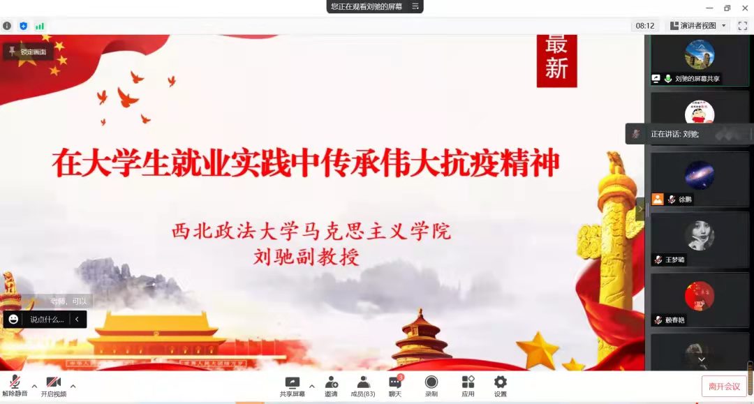刘驰书记从三个方面展开了本次讲座。首先,他梳理并阐释了近年来马学科及公司的就业情况,认为受政策和疫情的叠加影响,未来就业的形势会更加严峻,鼓励大家早做打算、积极主动就业。紧接着,刘驰书记向同学们分析了目前公司员工就业的途径和方向,引导同学们要树立正确的就业观,灵活就业,拓宽就业范围,为自己的发展设定长远的目标。其次,刘驰书记从弘扬抗疫精神,厚植家国情怀;发扬主动精神;坚持人民至上三个方面阐述了如何发扬伟大抗疫精神,并对在抗疫过程中发挥先锋模范作用的马院志愿者们表示肯定和赞扬,勉励同学们继续传承和发扬志愿精神。最后,刘驰书记列举了历届马院毕业生的就业去向,对往届毕业生到西部地区就业创业、到基层磨练自身的事迹表示肯定,希望马院学子不负韶华、不负青春、不负时代,在实现中华民族伟大复兴中国梦的伟大征程中实现自己的职业梦想。