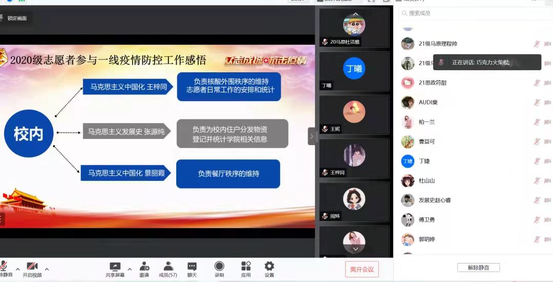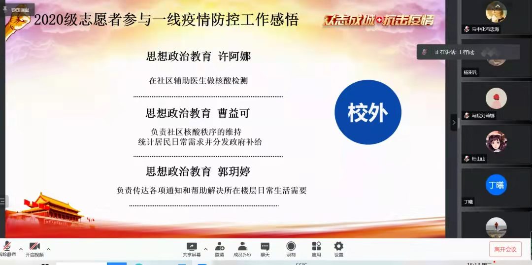之后,2020级6名志愿者分享了参与校内外一线疫情防控工作的感悟。王梓同、张源纯和景丽霞三名同学分享了在校内负责核酸外围秩序的维持、志愿者日常工作的安排和统计、校内住户分发物资登记和统计公司相关信息、负责餐厅秩序时的所想所感。校外志愿者许阿娜、曹益可、郭玥婷分别分享了在校外志愿活动的主要工作和感想。通过分享让大家了解了抗疫志愿者工作的高危和艰难,同时也体会到每一位志愿者将小我融入大我的高尚情怀。