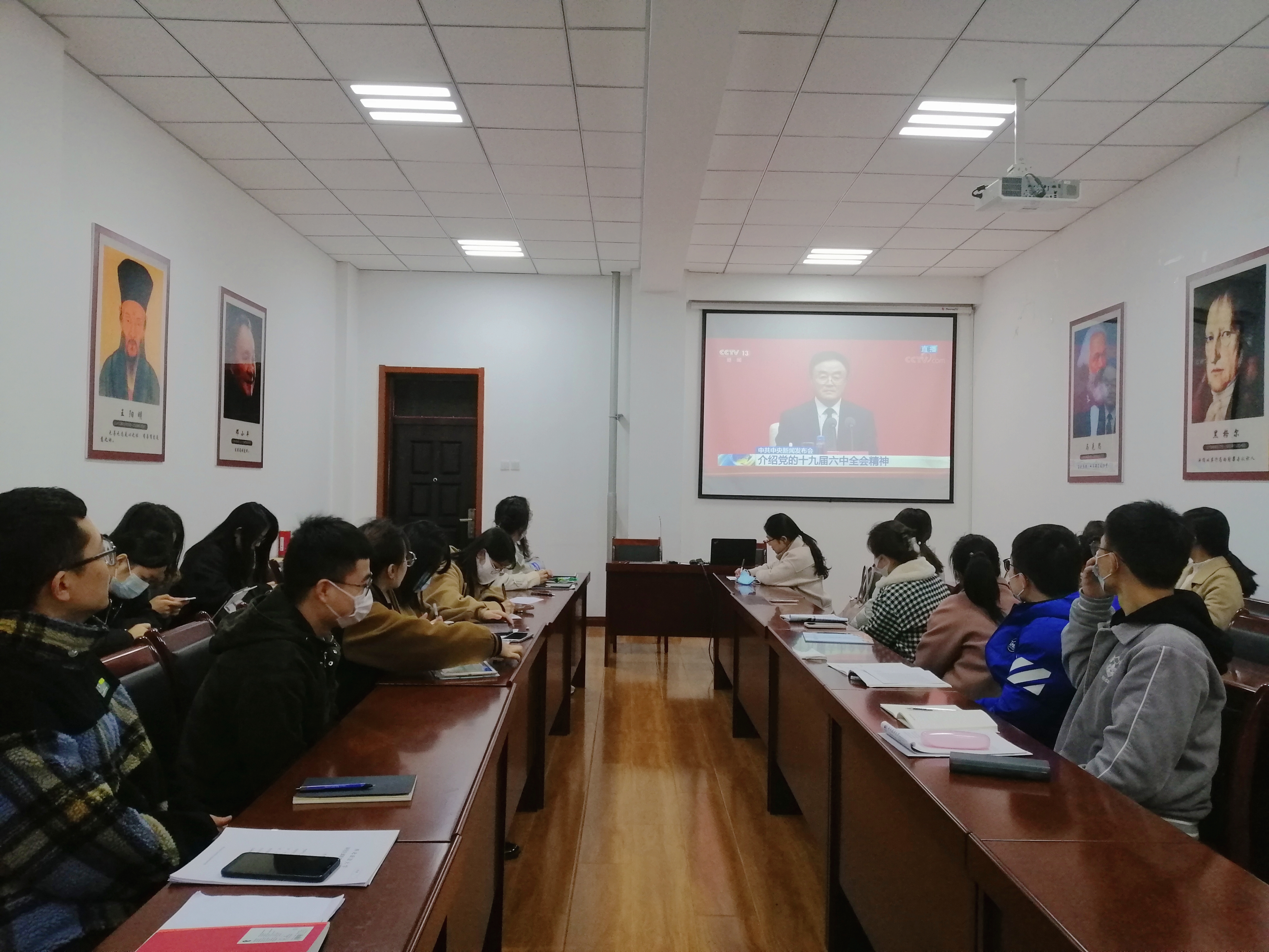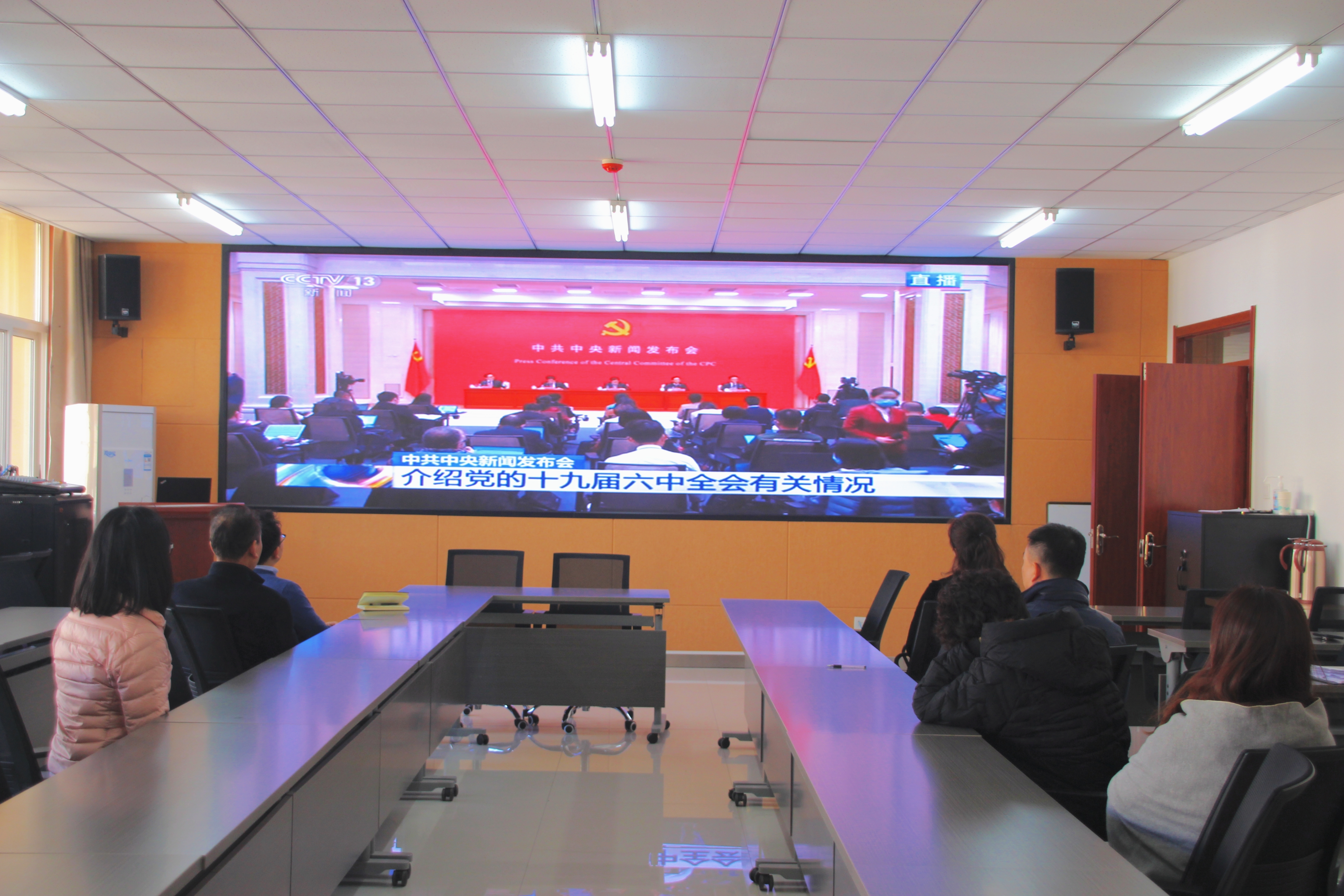 11月12日上午,中共中央举行新闻发布会介绍党的十九届六中全会精神。bevictor伟德高度重视,结合实际情况分别组织没有课的教师和全体研究生在长安校区、雁塔校区集中收看了新闻发布会直播,第一时间学习了全会精神。
