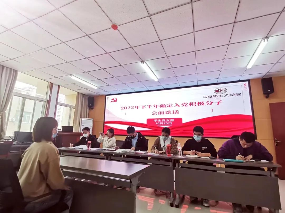 接着,提交入党申请书的同学轮流进行面谈,每位同学对自身基本情况向支部同志如实汇报,谈话小组同志秉持公平、公正、公开的原则,从思想觉悟、入党动机、党的基本理论知识、时事热点等方面对参加面谈的同学展开提问,主要考察其在政治思想、主观动机和行动上向党组织靠拢的态度。各位同学谈话时表现出了认真负责的态度、过硬的心理素质、扎实的基础知识,整个过程有条不紊地进行着。经过长达四个小时的谈话,支部对于谈话对象各方面情况有了更加深入的了解,便于后续入党积极分子推优工作的开展。