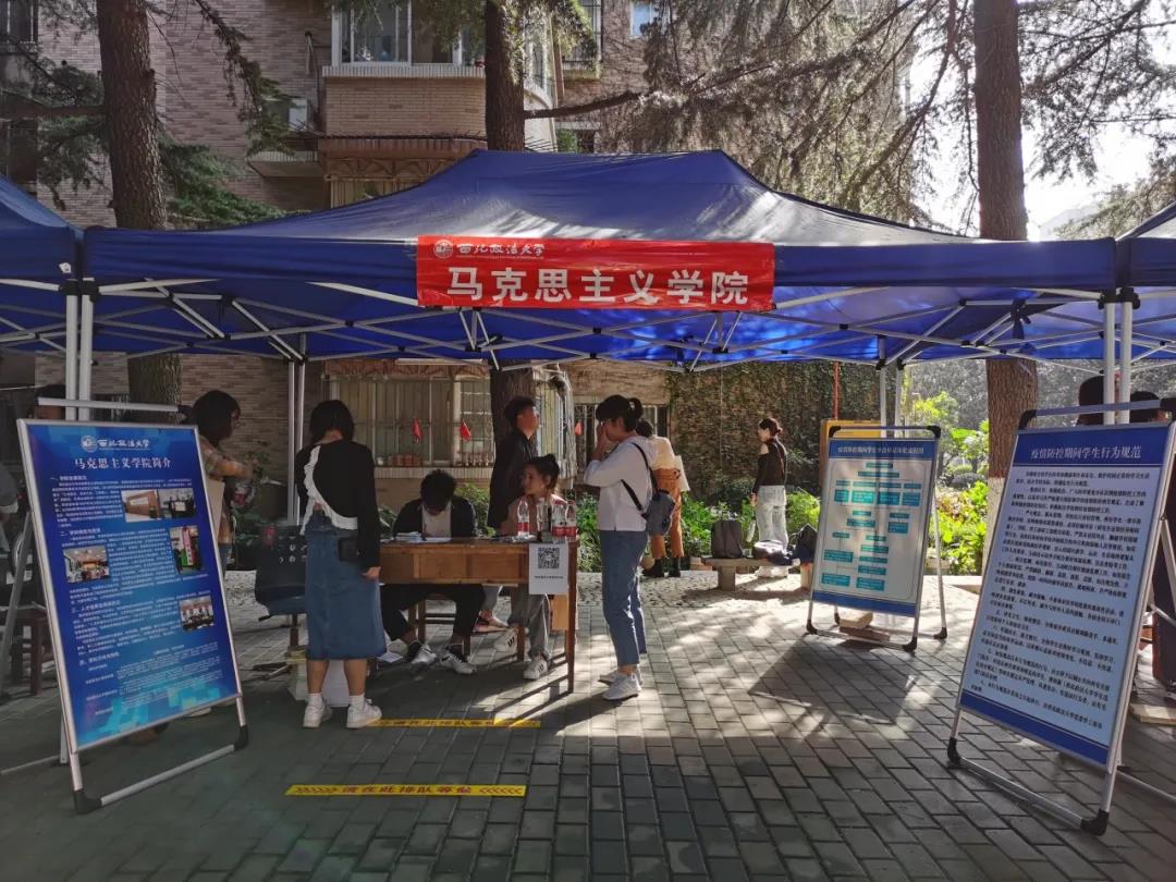 早晨7点30分,负责接待新生的老师和员工志愿者们准时到达接待点,一切准备就绪,等待新生的到来。接待点前,志愿者们严格按照报到流程热情又耐心的引导新生报到注册,并向新生发放了马院为同学们赠送的《习近平新时代中国特色社会主义思想学习纲要》以供学习。