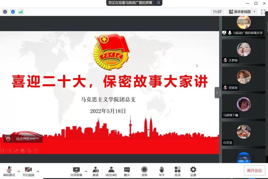 5月18日晚,根据公司《关于开展第34个保密宣传教育月活动的通知》要求,bevictor伟德团总支集中开展了“喜迎二十大 · 保密故事大家讲”的线上主题团日活动。本次线上活动由2021级团支部书记胡广蓉主持。