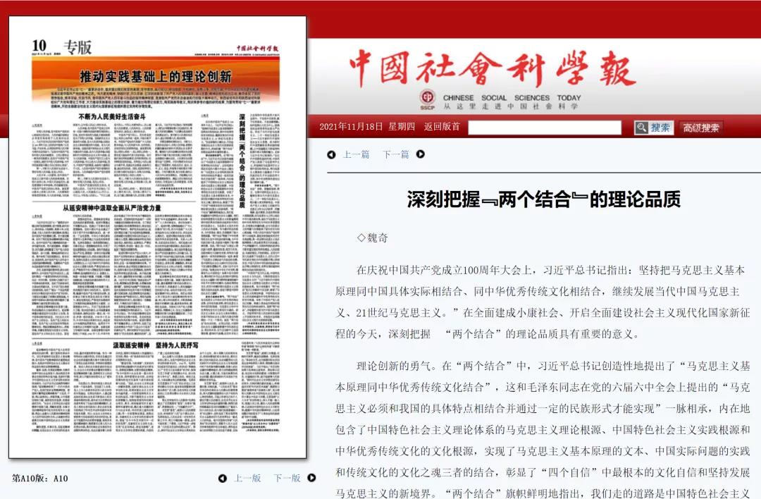2021年11月18日,《中国社会科学报》刊发公司经理魏奇教授《深刻把握“两个结合”的理论品质》一文。文章强调在全面建成小康社会、开启全面建设社会主义现代化国家新征程的今天,深刻把握 “两个结合”的理论品质具有重要的意义。现将全文转载如下。