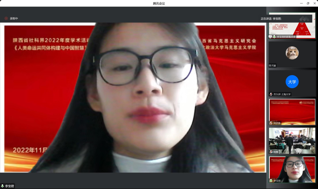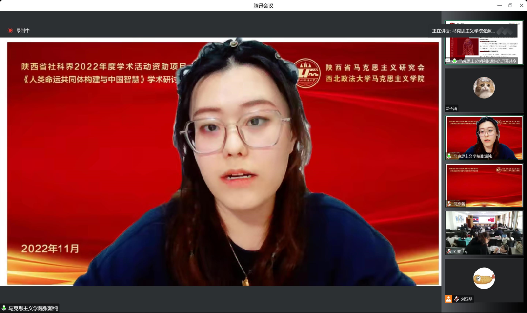 大会第四阶段发言结束后,公司刘亚玲教授分别对五位同学的发言做出点评。她指出,各位学者对于人类命运共同体的研究体现了对马克思主义的基础探索,表明马克思主义之所以能够在中国发展,是因为其能够深深扎根于中国传统文化土壤,具有一定的共通性,强调要始终坚持将马克思主义基本原理同中国具体实际相结合、同中华优秀传统文化相结合,不断谱写马克思主义中国化时代化新篇章。